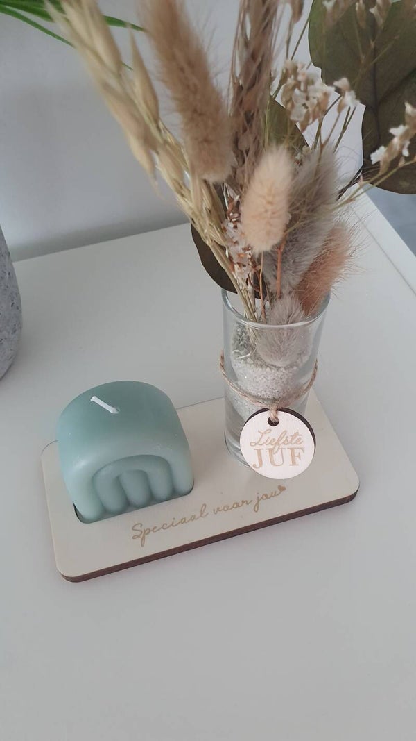 Bestaande uit kaars (regenboog), vaasje met droogbloemen en label en plateau.
