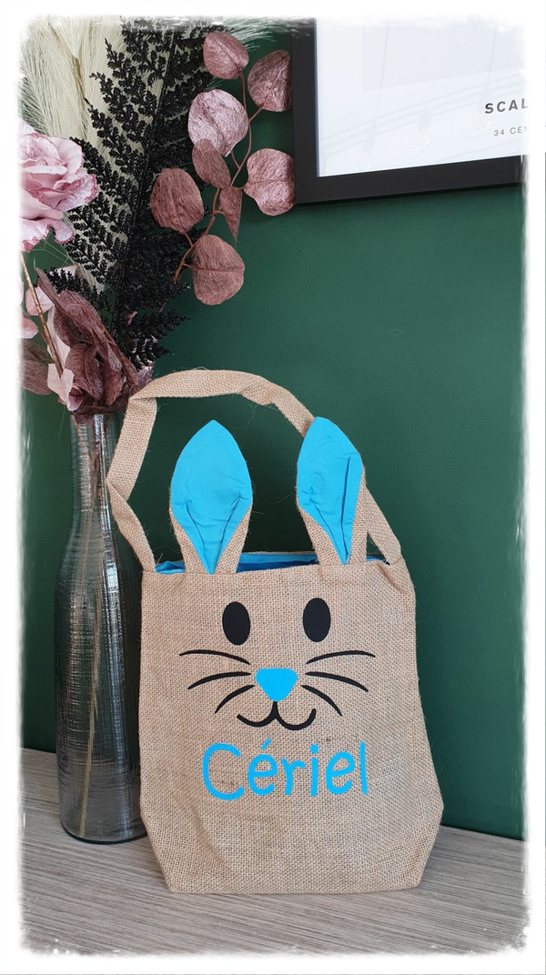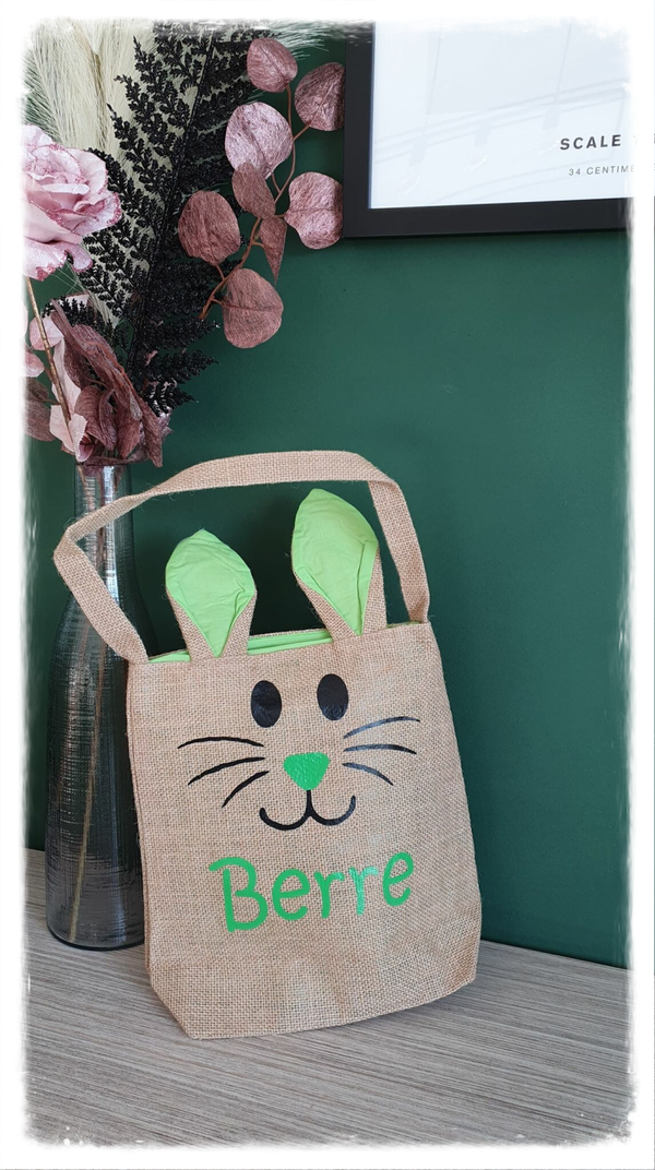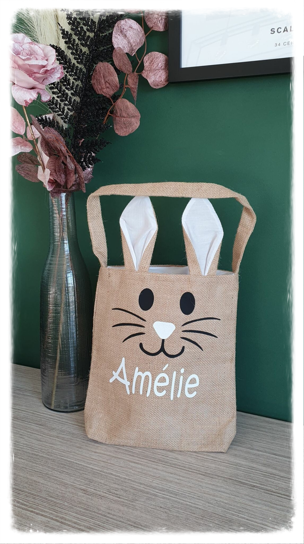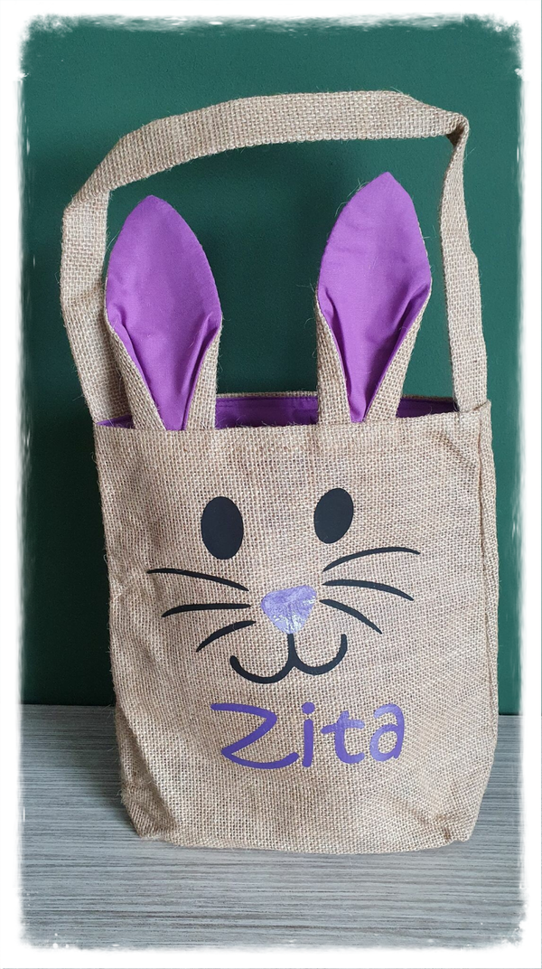 Prachtige paaszak met gekleurde oortjes met jouw naam. Leuk om alle eitjes in te verzamelen.