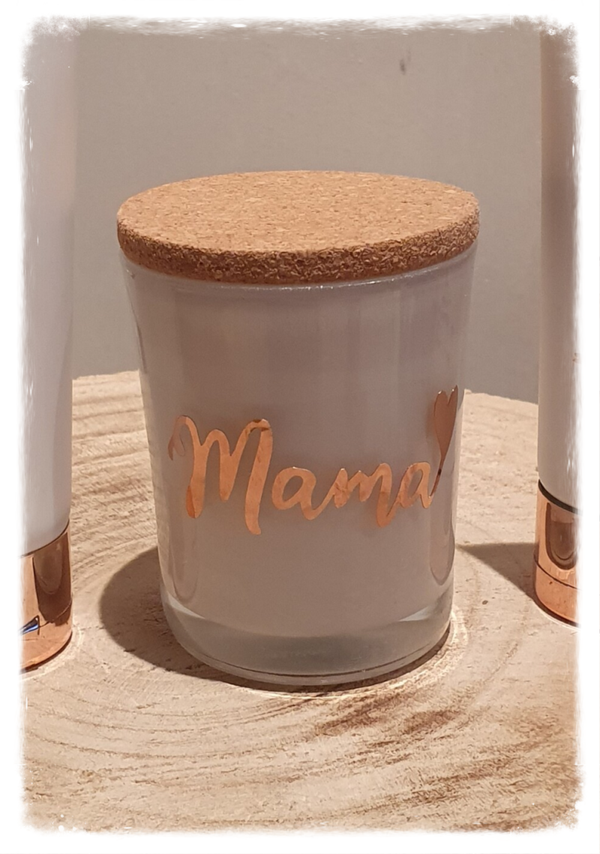Geurkaarsen zijn een must in elk huishouden. Naast een aangemane geur, bregen ze ook sfeer en gezelligheid. Geurkaars met opdruk naar keuze en kurkdeksel.