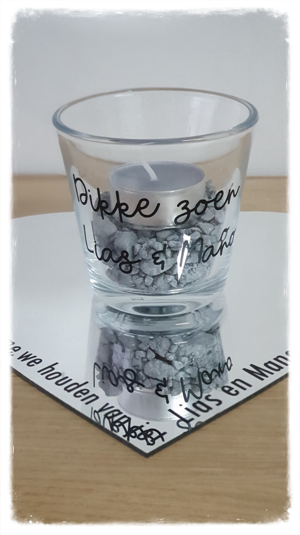 Je kan de tekst volledig zelf kiezen ook de plaats naar keuze (onderaan op over de volledige spiegel)