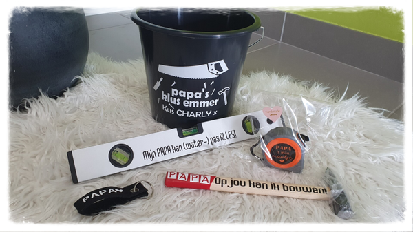 De werkset bestaat uit een emmer, hamer, waterpas en rolmeter. Het werkgereedschap is te personaliseren naar keuze.