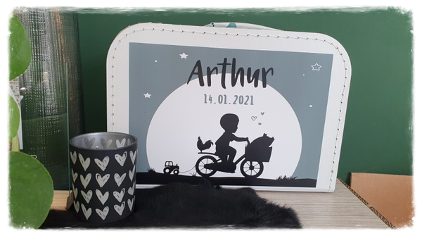 Dit leuke koffertje in het wit, met opdruk van het geboortekaartje is een uniek geschenk!