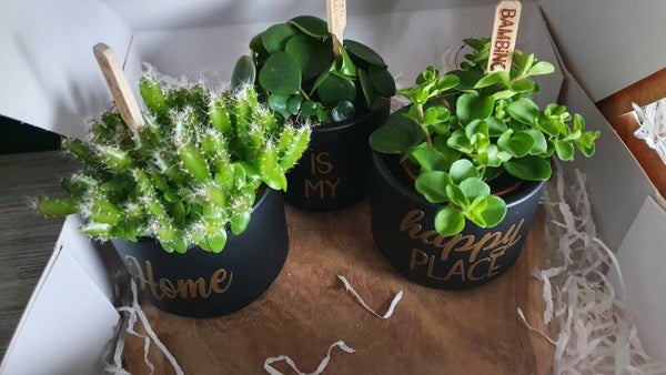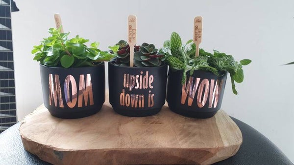 3 bloempotjes uit keramiek met opdruk naar keuze. We maakten enkele voorbeeldteksten. Wil je graag een andere tekst of een klein hartje toevoegen? Dat kan! Geef door via opmerkingen.