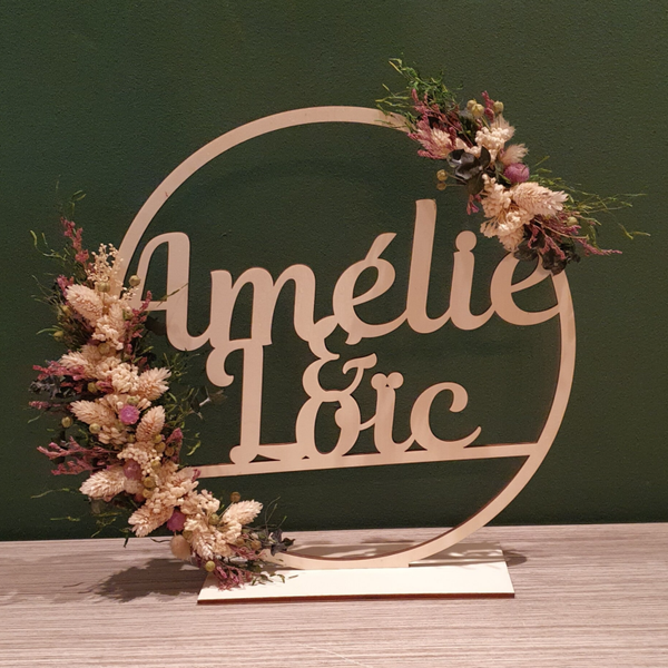 Luxe houten woord of naam in kring met droogbloemen. (30cm)