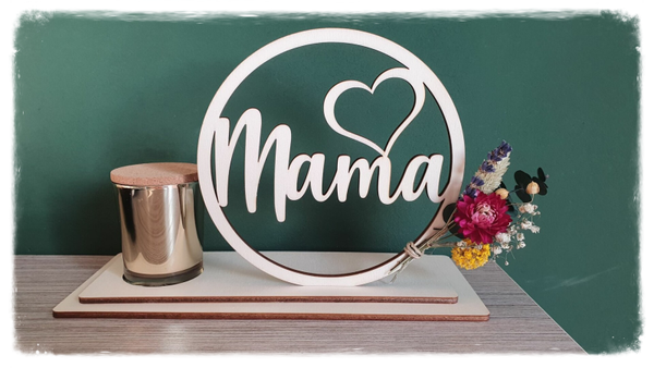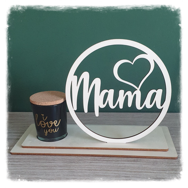 Cirkel met tekst uitgesneden op voet ,diameter 16 cm. Hiernaast staat een kaarsje in kleur naar keuze. De volledige lengte van het plankje is 25 cm.