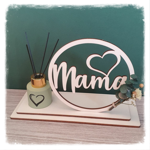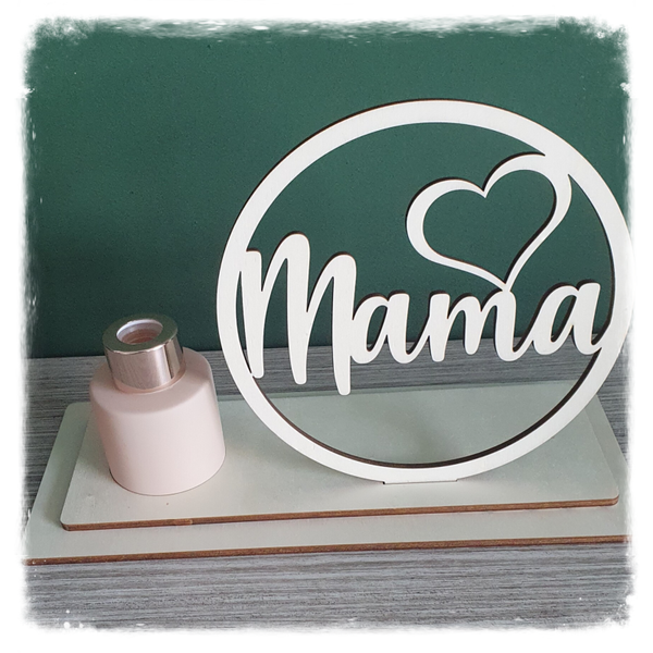 Cirkel met tekst uitgesneden op voet ,diameter 16 cm. Hiernaast staat een geurflesje in kleur naar keuze. De volledige lengte van het plankje is 25 cm.