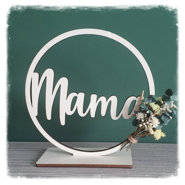 Houten cirkel met woord en klein boeketje droogbloemen (20cm)
