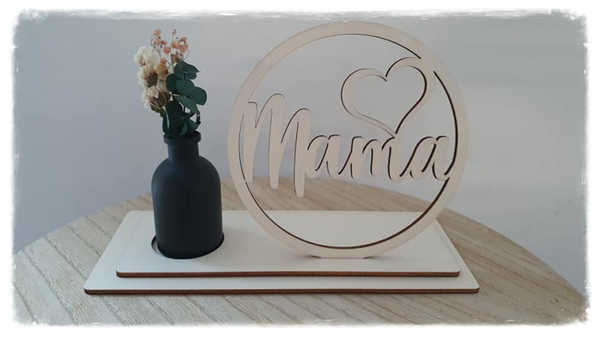 Cirkel met tekst uitgesneden op voet ,diameter 16 cm, versiert met een vaasje waarin prachtige droogbloemen zitten. De volledige lengte van het plankje is 25 cm.