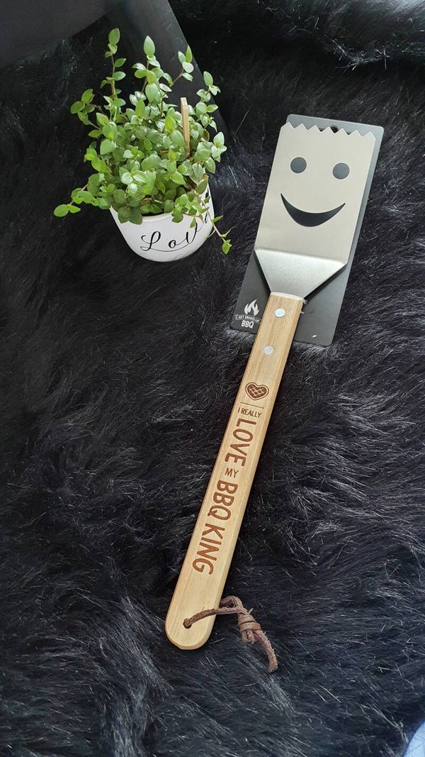 Spatel voor de barbecue met leuke tekst. Met ophangoog.Vaatwasbestendig, maar advies is om hem met de hand af te wassen zodat hij langer mooi blijft.