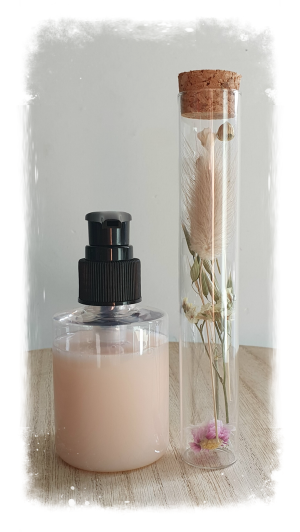 Setje van een zeeppomp, verkrijgbaar met verschillende soorten zeep en een buisje met droogbloemen.