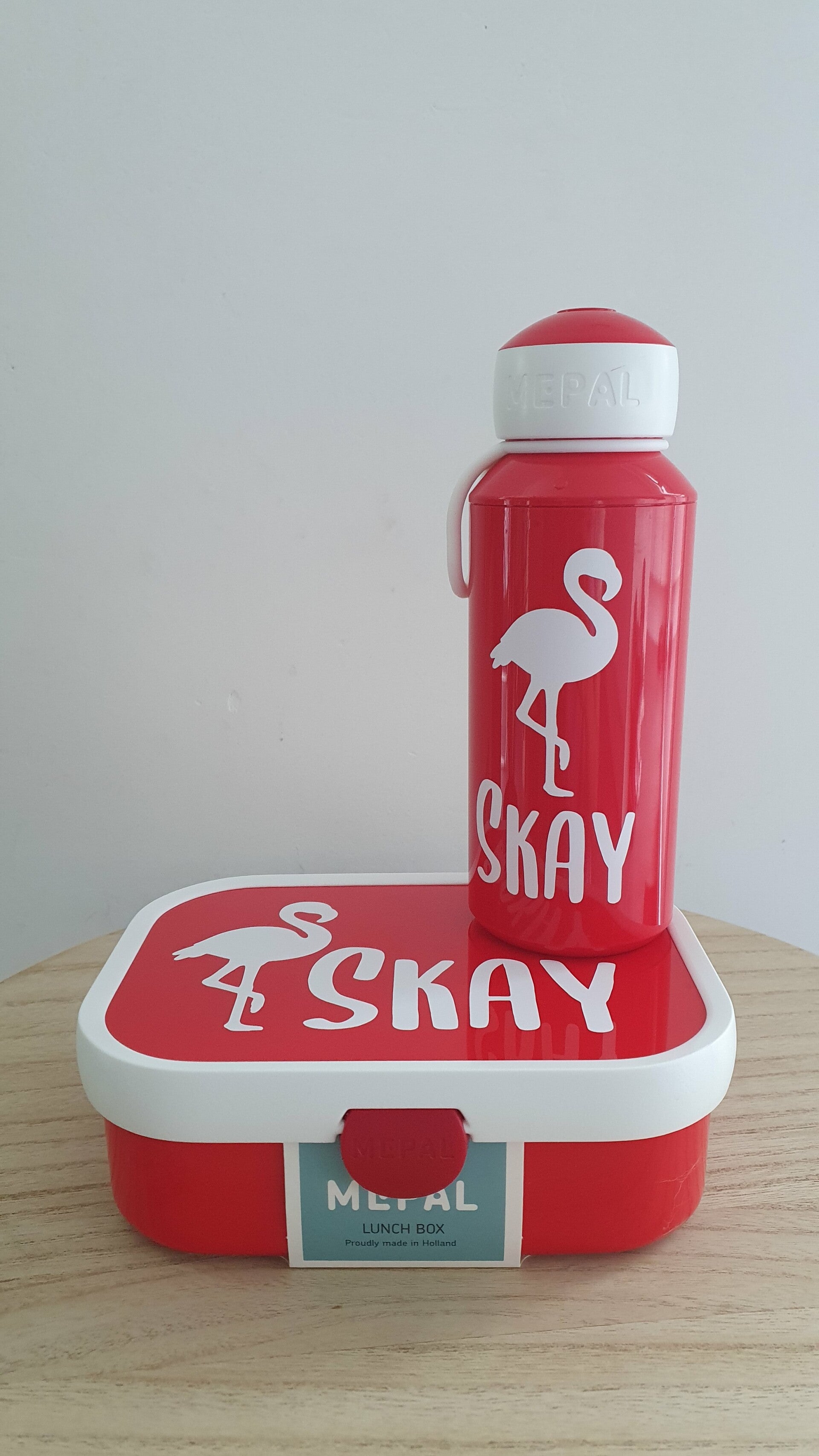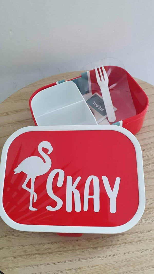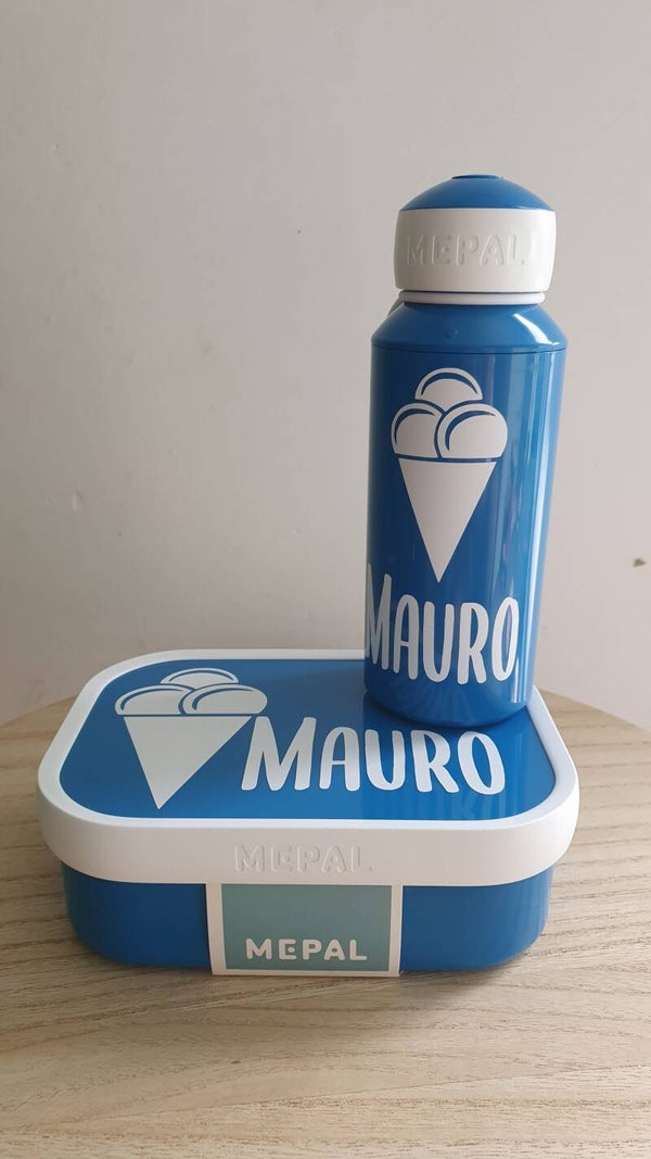 De lunchbox en fles worden bedrukt in het wit met naam en eventueel figuurtje. Deze worden best met de hand afgewassen.