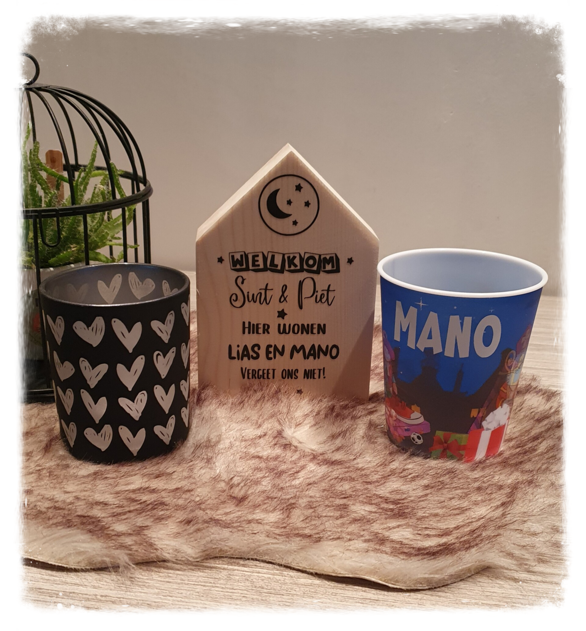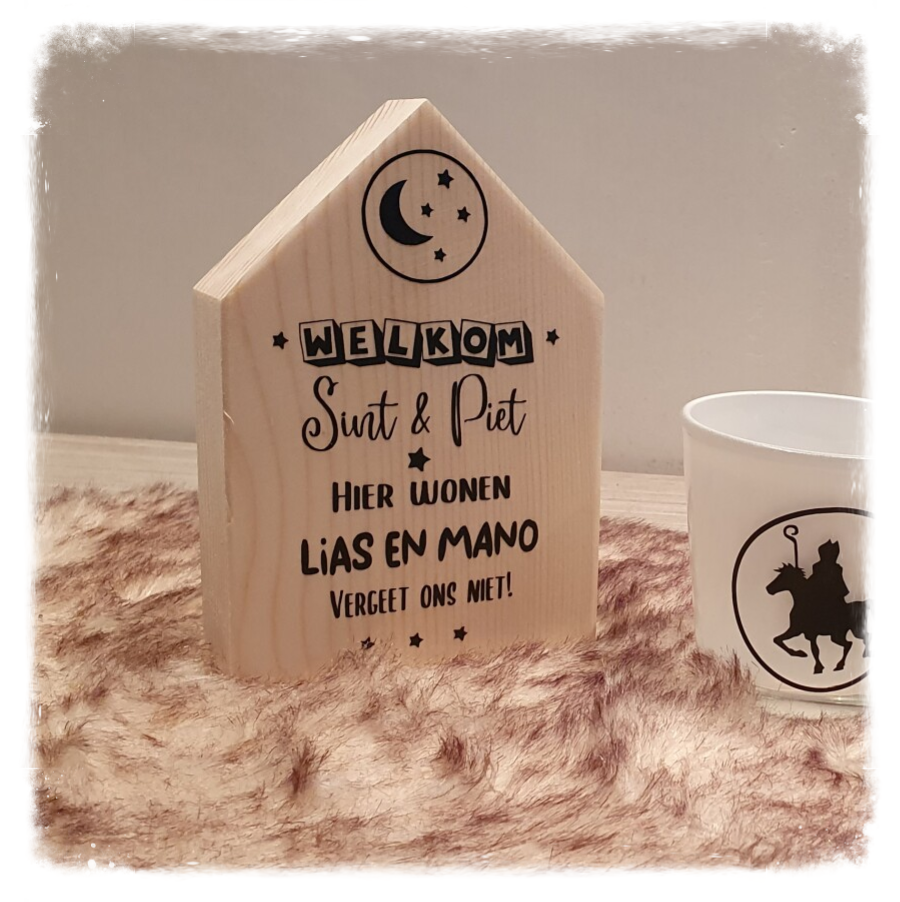 Superleuke en unieke Sinterklaasdecoratie. Houten huisjes met Sinterklaasafbeelding en namen van de kindjes. Geef de huisjes een mooi plekje en maak de Sinterklaastijd nog gezelliger.