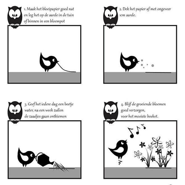 Deze bloeikaart stop je niet bij het oud papier als je er op uitgekeken bent, maar geef je een plekje in de grond. Geef voldoende water en voilà, binnen de kortste keren verschijnen er mooie bloemetjes.