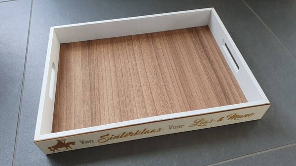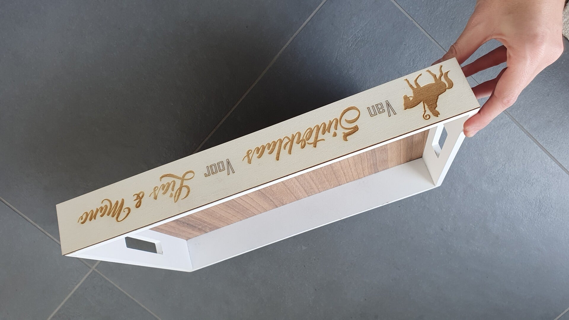 Deze plateau wordt gegraveerd aan de zijkant met tekst naar keuze. Dit gebeurt op een extra plaatje dat bevestigd wordt aan de zijkant van het dienblad. Je kan de tekst kiezen uit het menu of toevoegen bij opmerkingen.