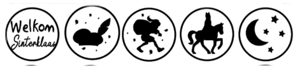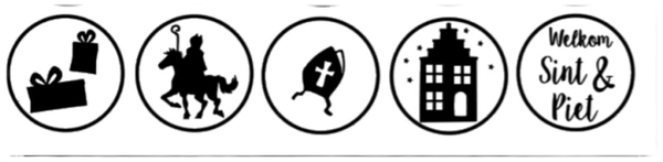 Set 1: 5 stickers: welkom sinterklaas, pietenbaret, zwarte piet met zak, sint op paard, maan en sterren