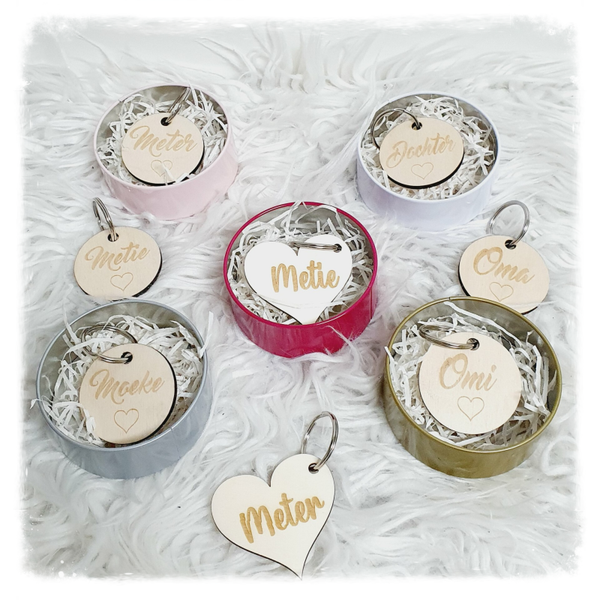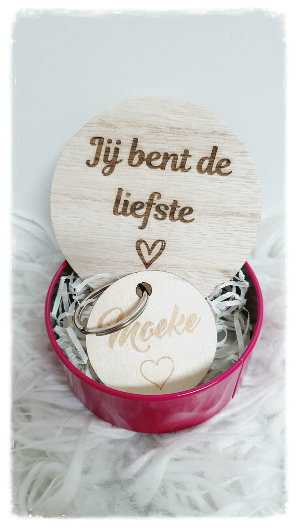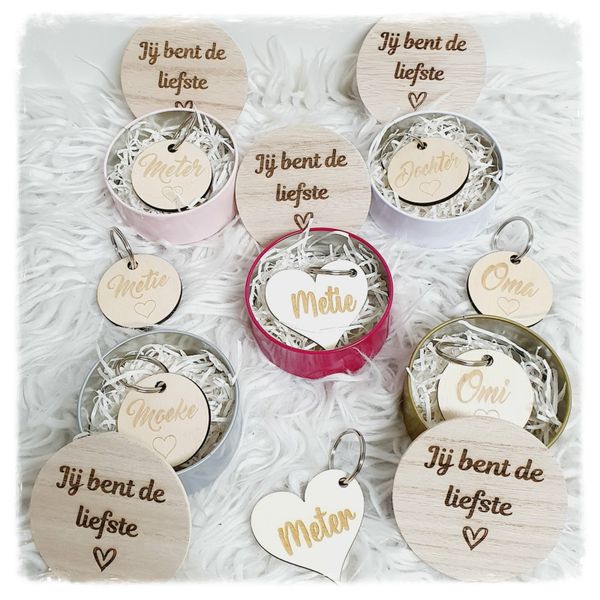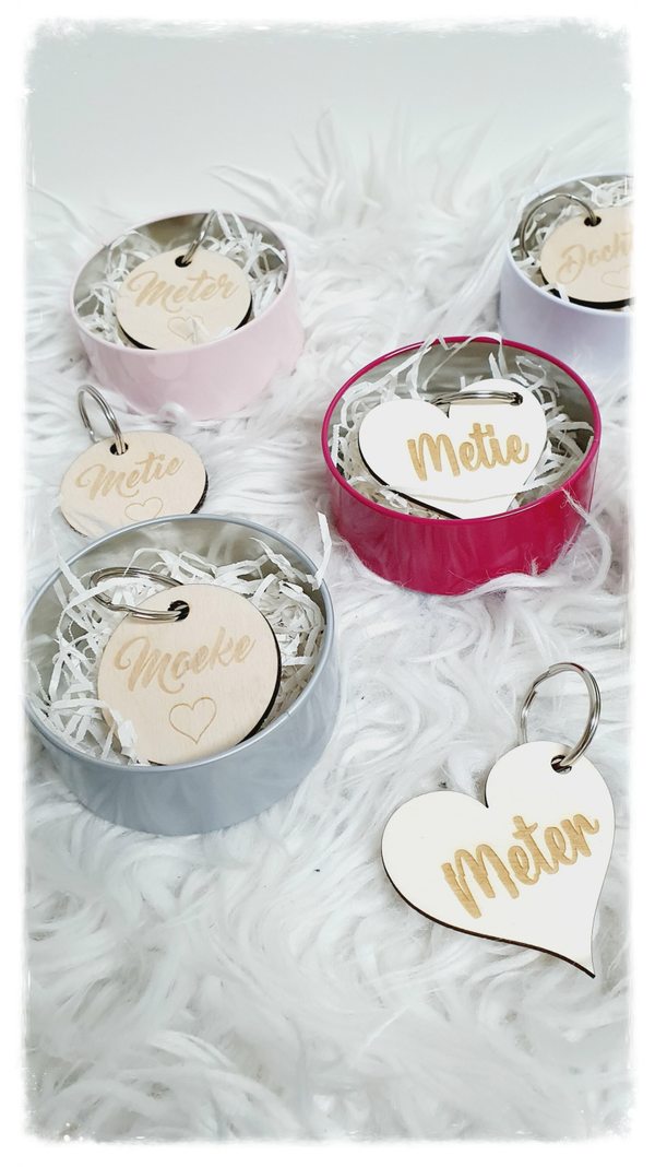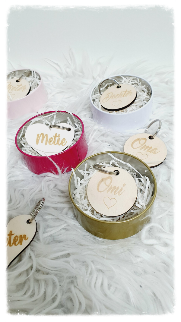 Metalen potjes in wel 5 verschillende kleuren met een gepersonaliseerd deksel en houten sleutelhanger!