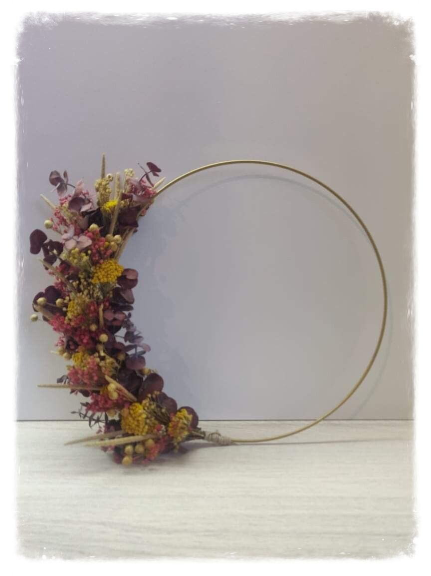 Een hele mooie hoepel met een prachtige creatie droogbloemen.
