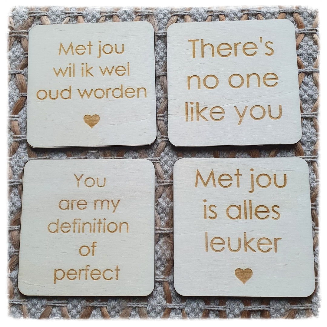 Set van 4 stuks met tekst zoals op de foto. (ong 10cm x10cm)