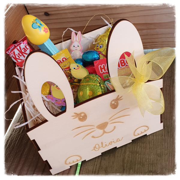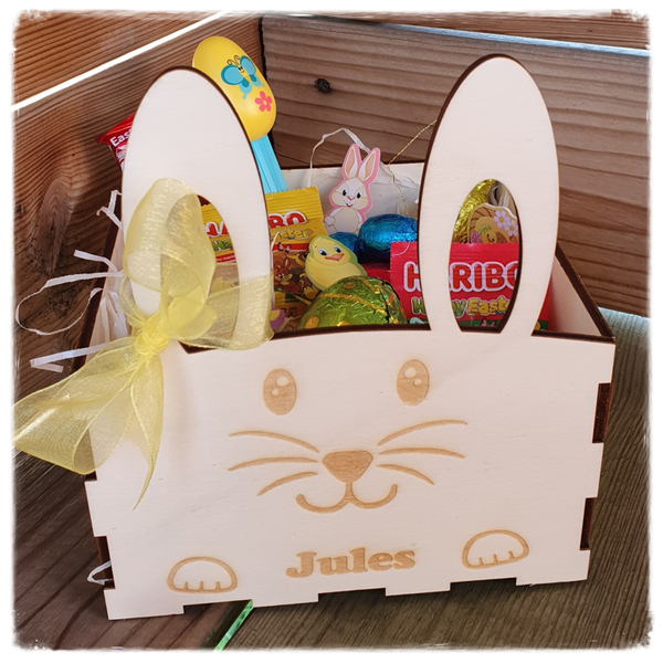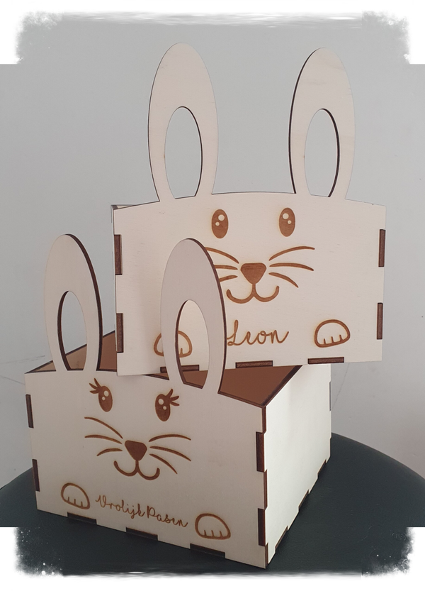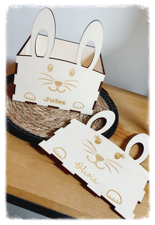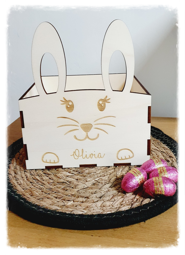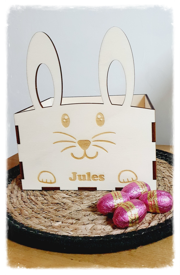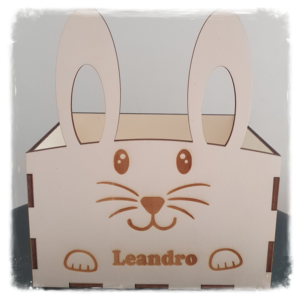Dit houten paasmandje in de vorm van een konijntje met eigen naampersonalisatie is superleuk om de eitjes in te verzamelen.