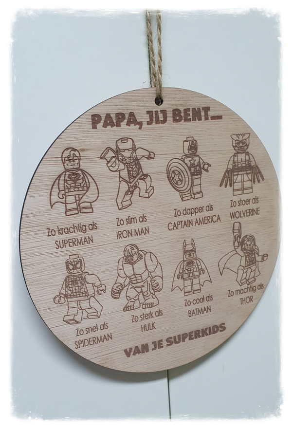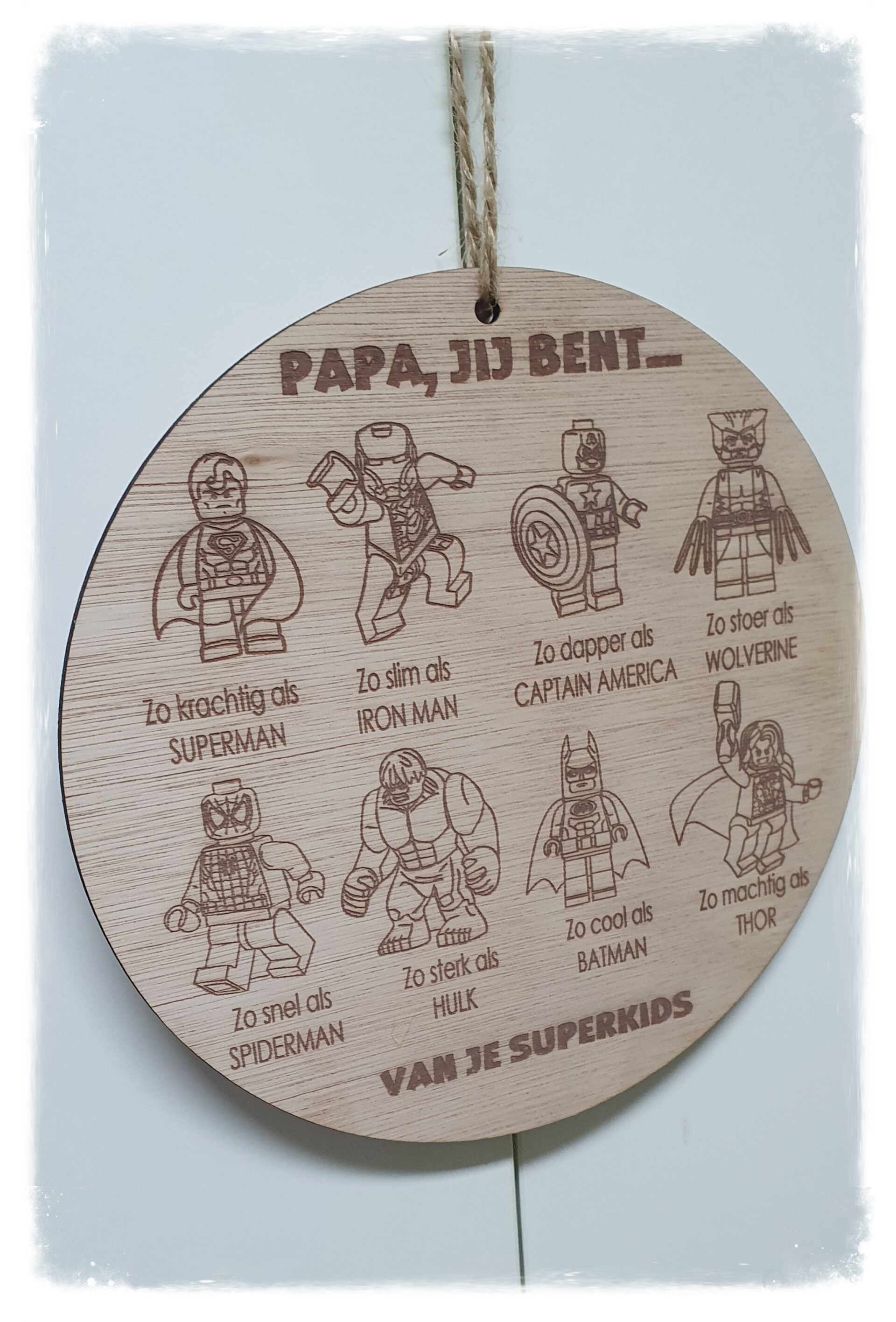 De tekstplaat met gegraveerde legofiguurtjes is ontworpen speciaal voor jouw superheld. Papa, peter, meester, ... zal dit geschenk ongetwijfeld geweldig vinden. Wie vergelijkt zich nou niet graag met een superheld?