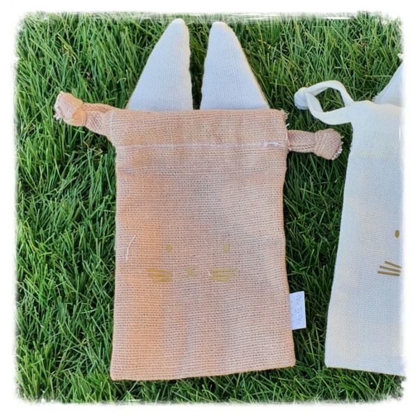 Linnen zakje konijn 12.5x8cm met gezicht gedrukt voor snoepjes of paaseitjes