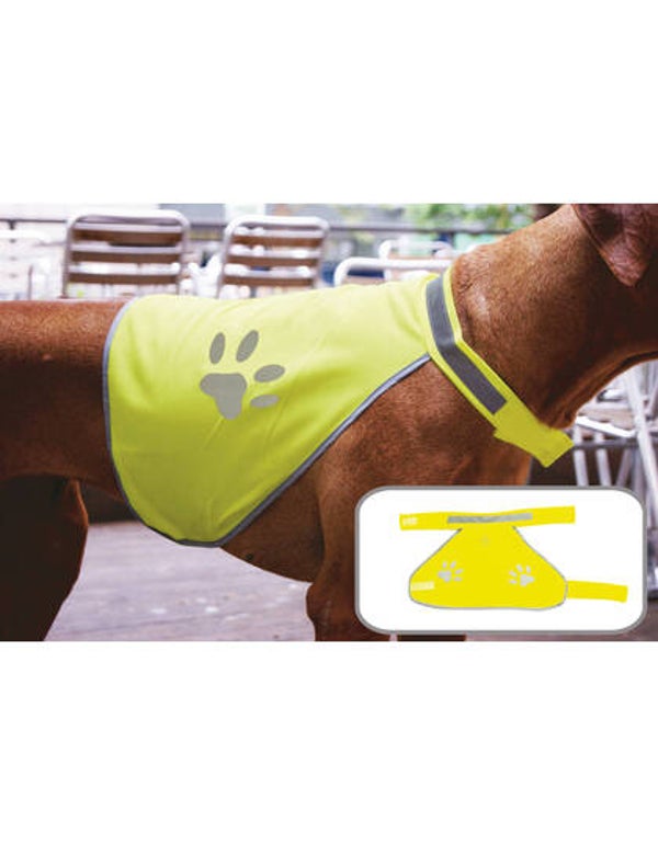 Opvallend veiligheidsvest / regenjas voor honden. De vestjes hebben een neongele signaalkleur en reflecterende elementen voor meer zichtbaarheid.